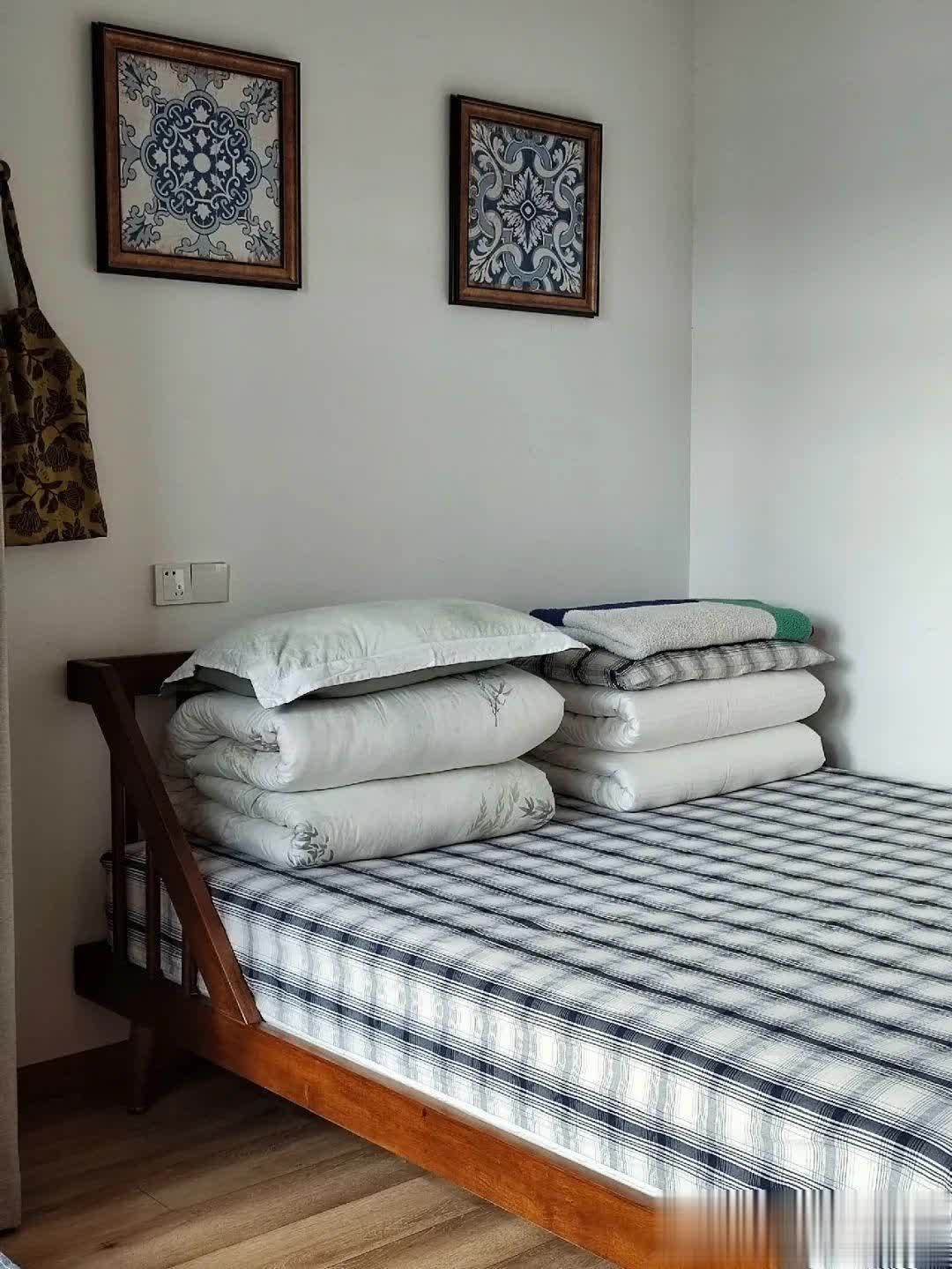 复古色调的实木床,上面的床品看起来很素雅,也很符合外婆这一代人的审美。床上的被子叠成豆腐块,看起来特别清爽、利落。
