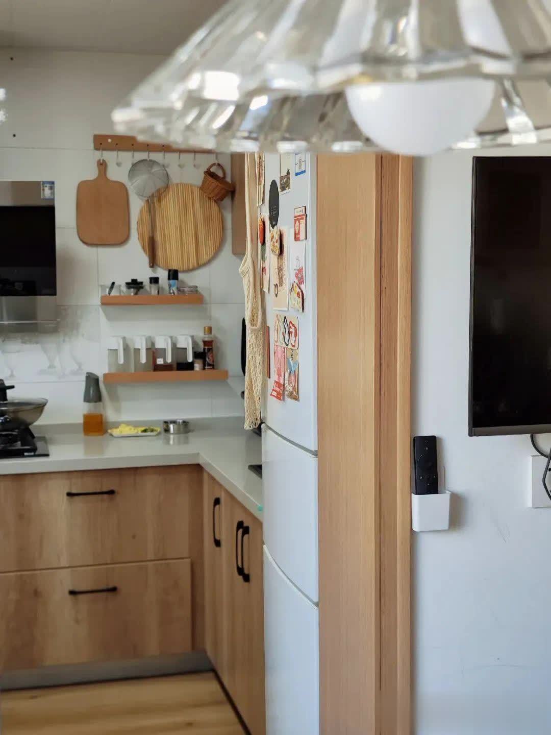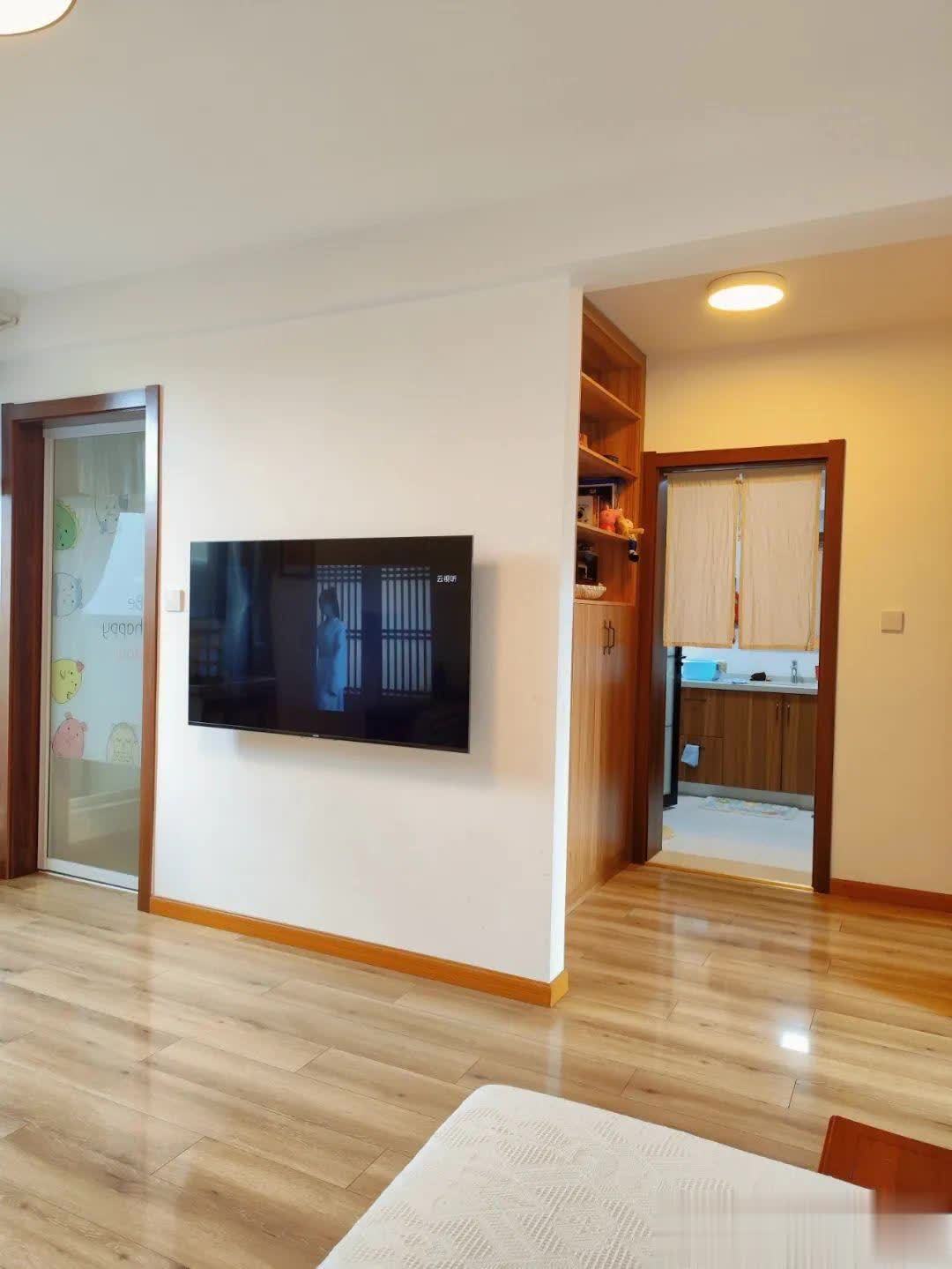因为这套房子比较小,再加上是老旧小区的结构,电视墙也是小小的,直接把电视机悬挂在墙壁上。