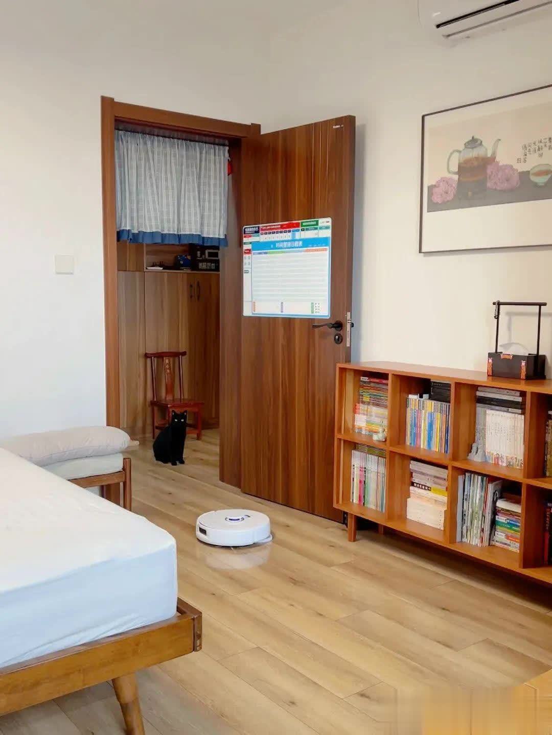 木地板和大白墙,从客餐厅延伸到了卧室里面。原木色的房门、柜门、书架,和整体的简约风格设计非常匹配,看起来很温馨、舒适。