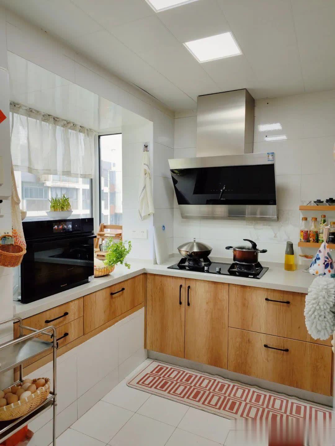 厨房的墙壁上,还安装了一些收纳架和收纳挂钩,方便收纳一些调味品和餐具、厨具。