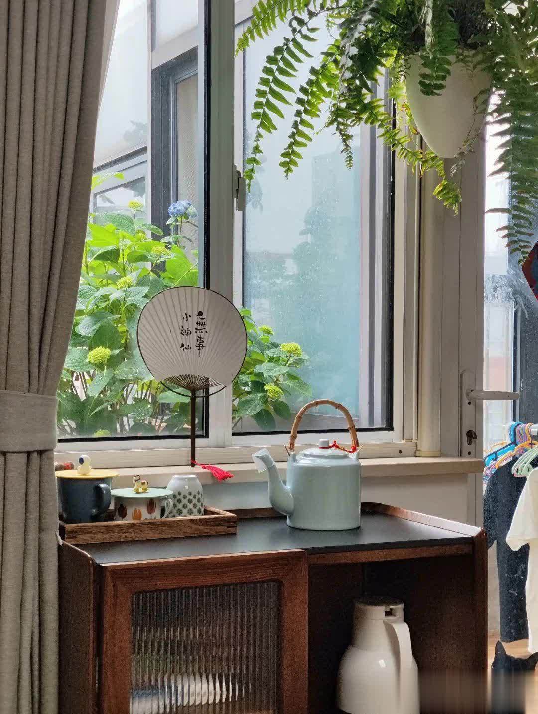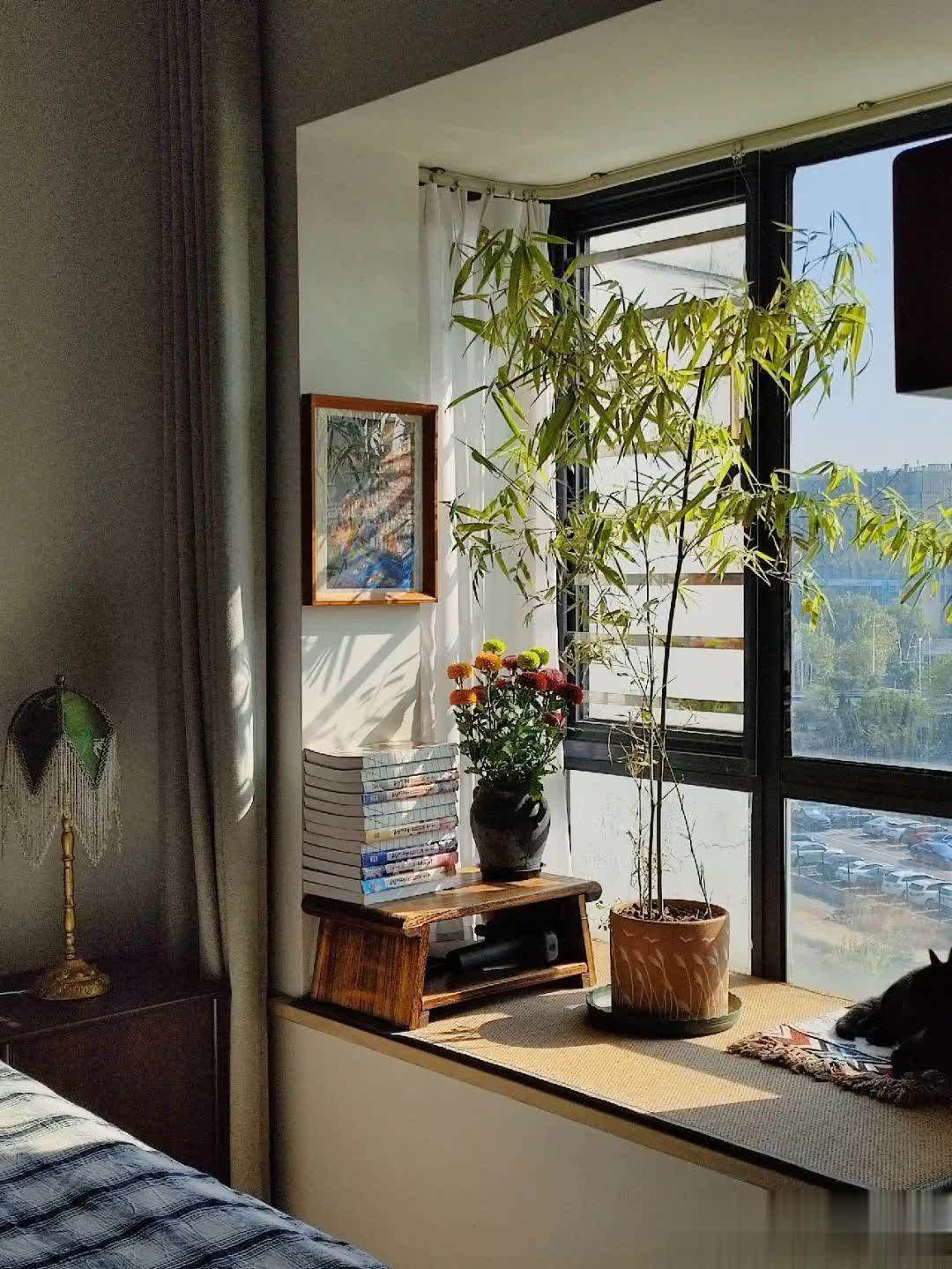 飘窗上面铺着草垫,摆放一盆绿植,上面还有小桌几。闲暇的时候可以在这里看看书、晒晒太阳、看看窗外的风景,也是一件非常惬意的事情。
